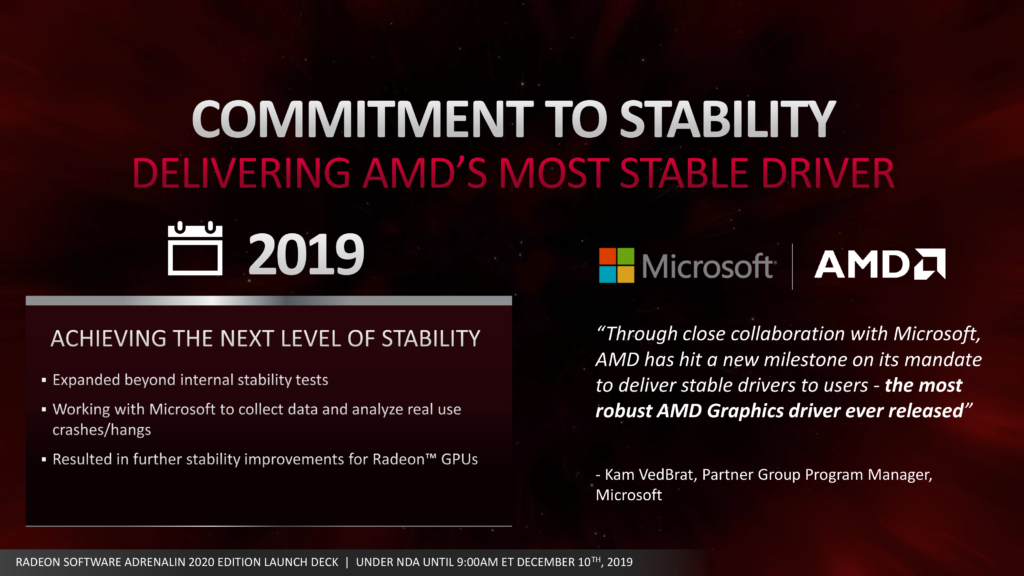 AMD started this tradition with its Catalyst Omega release in December of 2014. AMD at this time committed to a new driver release schedule that would include one big yearly release every year, typically in December, that combines new features and performance updates. To this date, AMD has fulfilled that promise. In 2015 AMD released AMD Radeon Crimson Edition. Following that in 2016 AMD released the Radeon ReLive Edition. In 2017 AMD released Radeon Software Adrenalin Edition. In 2018 AMD continued the Adrenalin name with the new 2019 Edition.