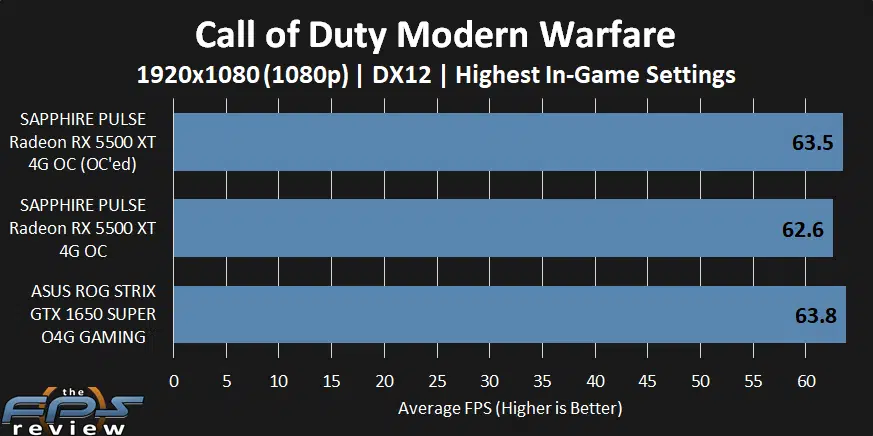 In this graph, we have lowered the game settings to “High.” Now we are averaging in the ’70s which keeps the minimum framerates in the ’50s while playing. Once again, we see the GTX 1650 SUPER pull ahead of the new RX 5500 XT in this game. However, once we overclock the RX 5500 XT it overtakes the GTX 1650 SUPER.
