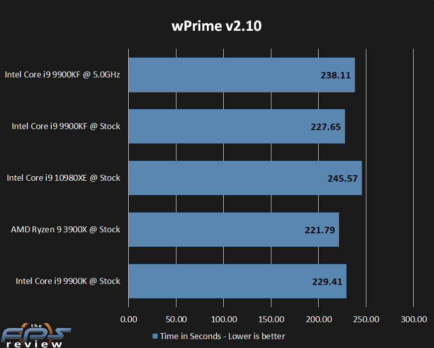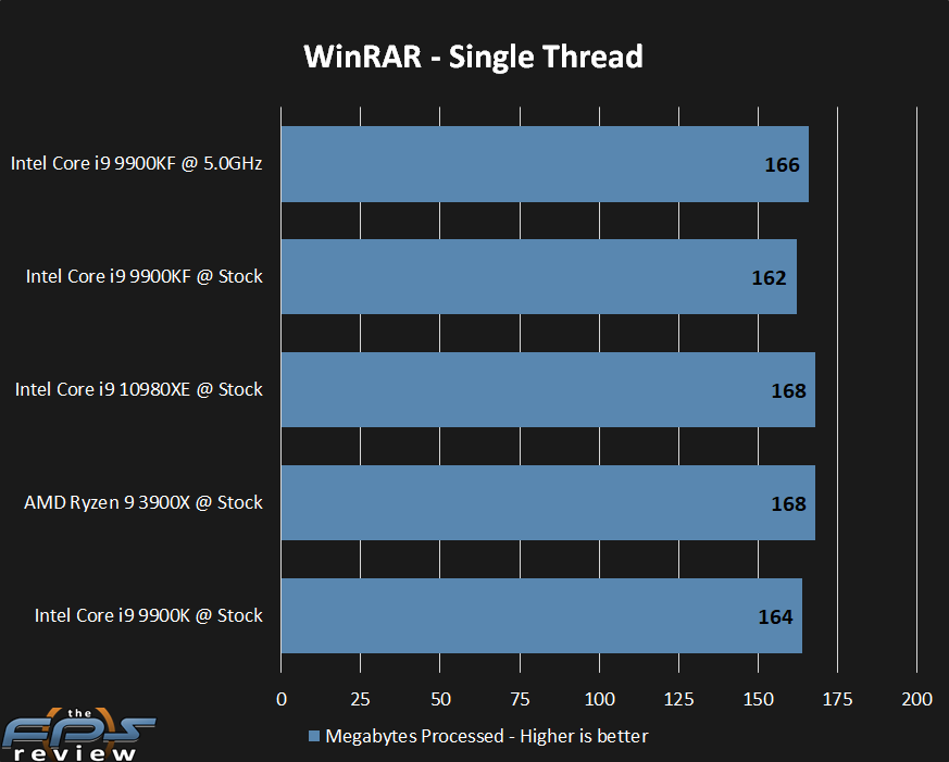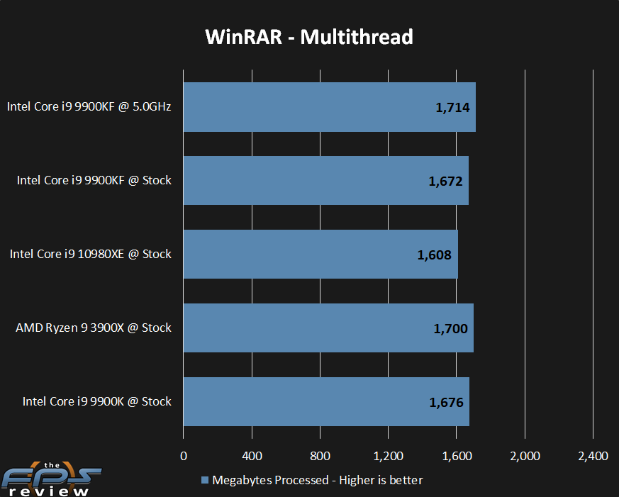 As stated many times, this is an odd test. The results favor clock speeds as well as multi-threading. Here, the 9900KF is competitive with the 3900X at both stock and overclocked speeds.