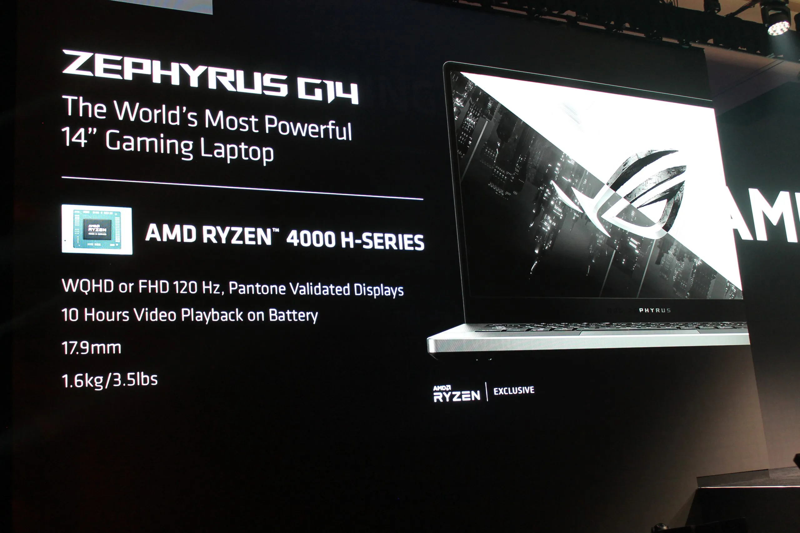 The ASUS ROG ZEPHYRUS G14 laptop was shown sporting the new Ryzen 4000 H-SERIES processors. It will have a 14” WQHD or FHD 120Hz display, 10 hours of video playback on battery, 17.9mm z-height and weigh only 3.5lbs. It will be available in February of this year.