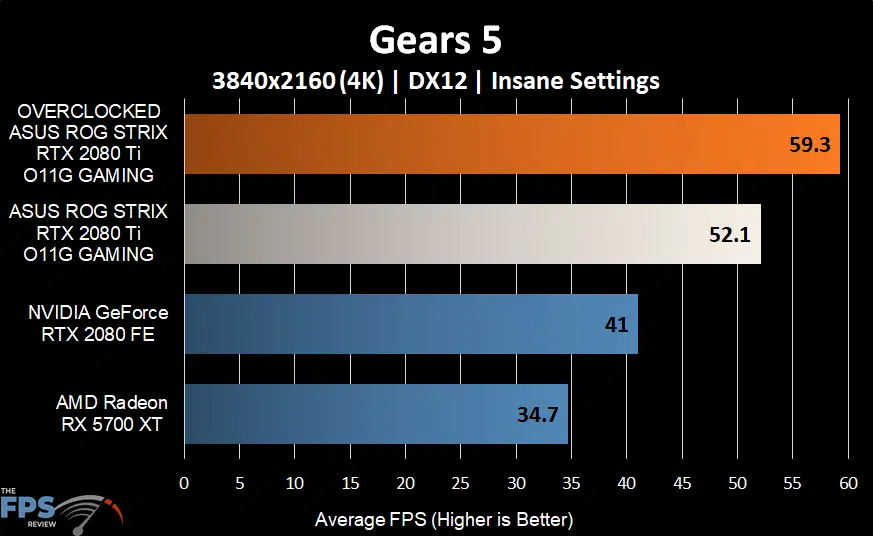 Only the ASUS ROG STRIX RTX 2080 Ti O11G GAMING is playable at this Insane setting at 4K. More-so when you overclock it, which brings it to 60FPS at 4K. Overclocking improved performance by 14%.