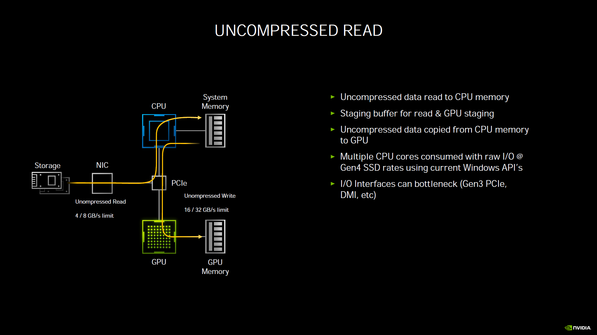 This does not mean games can use your SSD as “RAM” or “VRAM” storage, like the PlayStation 5. It simply means the decompressing of data can be offloaded to the GPU and sent directly to VRAM bypassing bottlenecks of CPU burden and I/O. NVIDIA states that this will not take away from your GPU performance accelerating games, as the GPU takes very little resources to do this, it can do it very quickly, unlike the CPU. It will alleviate burdens in the system, not add to them.