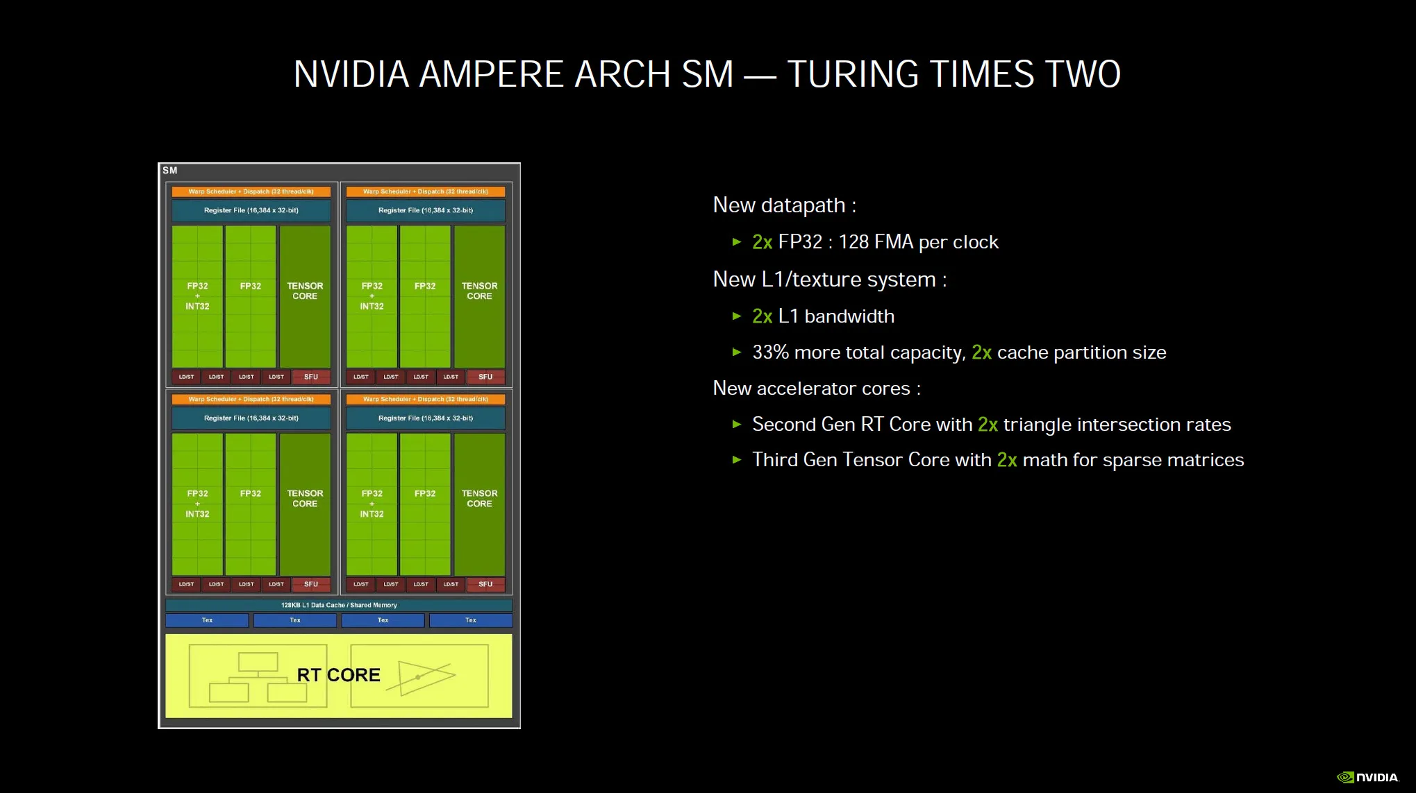Inside the SM each block has an FP32 and FP32+INT32 and a Tensor Core. The prior generation had just one separate FP32, one separate INT32, and two Tensor Cores. That’s right, Turing had 8 Tensor Cores per SM, and Ampere has 4. BUT, the Tensor Cores have been updated in capability, as we’ll discuss below.