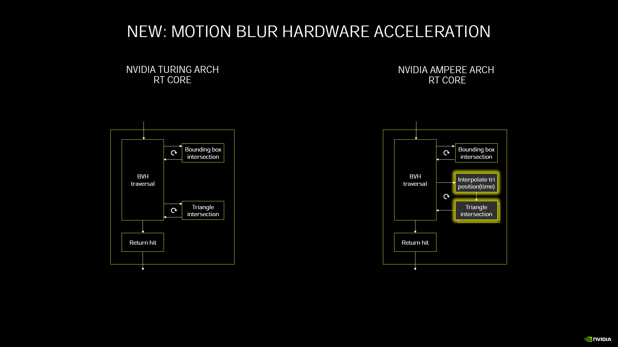 There are also more of them this generation in each video card. With Ampere RT Cores now accelerate Ray Tracing with Motion Blur. The pipeline adds an Interpolate of triangles by position in time, something which the prior generation did not have. The end result is that using Ray Tracing with Motion Blur is now up to 8x faster, motion blur is no longer a bottleneck when used with Ray Tracing.