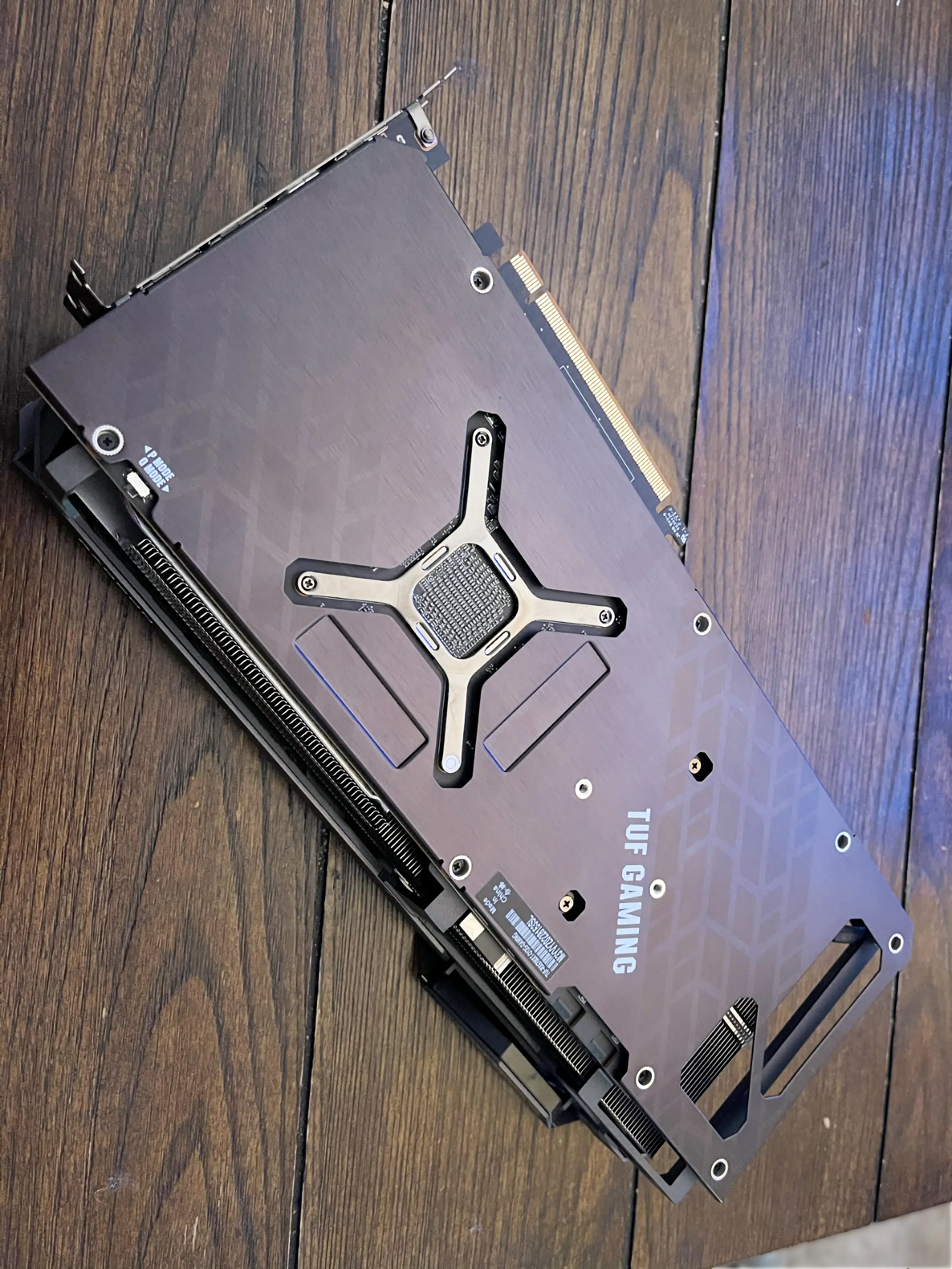 The video card is built with TUF Components, these are military-grade capacitors. They are soldered to the PCB using Auto-Extreme automated manufacturing with precise joints and the elimination of human error to meet rigorous specifications. The TUF has an armored undersize with a protective metal backplate that has a wide vent. Hot air can escape towards chassis exhaust fans. A GPU bracket provides extra stability and stainless steel is used for the I/O bracket.