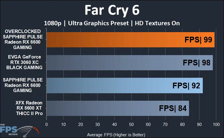 We are adding Far Cry 6 to our testing suite. If you haven’t, check out our Far Cry 6 Video Card Feature Performance Review for more information about the game and its graphics features. In the above graph, we are simply running at 1080p in the game with the “Ultra” graphics preset and HD Textures turned on. We are not running Ray Tracing or FSR, just “Ultra” settings. First off, the SAPPHIRE PULSE RX 6600 is producing very playable framerates, very near 100FPS average while playing. This is very smooth and plays nice. The SAPPHIRE PULSE RX 6600 is about 10% faster than the RAdeon RX 5600 XT, which doesn’t seem like as much as we would have thought it would be. Interestingly the GeForce RTX 3060 is beating the SAPPHIRE PULSE RX 6600 by 7%. However, both offer a great experience regardless. Overclocking the SAPPHIRE RX 6600 makes a big difference of 8% and is now just as fast as the GeForce RTX 3060.