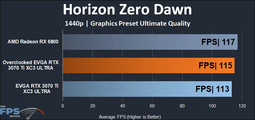In Horizon Zero Dawn the EVGA GeForce RTX 3070 Ti XC3 ULTRA GAMING averaged 113 FPS, just a few frames behind the AMD Radeon RX 6800 at 117 FPS. Overclocking the EVGA GeForce RTX 3070 Ti XC3 ULTRA GAMING increased performance by 1.8% leaving it 2 FPS short of the RX 6800. With all cards turning in scores over 100 FPS, they’re all great choices for Horizon Zero Dawn.
