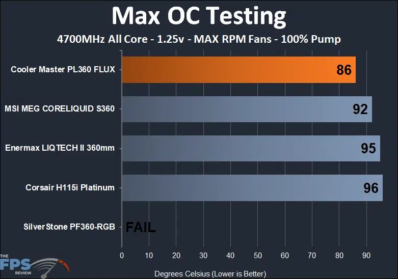 Setting our test bench to “large flaming blowtorch mode” showed that the Cooler Master MasterLiquid PL360 FLUX came out on top of all of the other contestants and gave us the best performance that we have ever seen here.