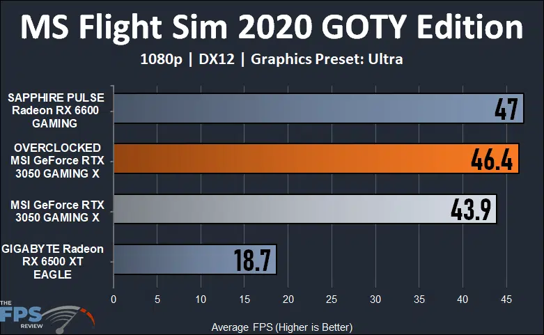 At 1080p in MS Flight Sim 2020 GOTY Edition in “Ultra” the MSI GeForce RTX 3050 GAMING X is playable, but just barely. The Radeon RX 6500 XT is completely unplayable and very choppy in this game. The MSI GeForce RTX 3050 GAMING X is 135% faster than the Radeon RX 6500 XT in this game and therefore offers a vastly superior gameplay experience. Overclocking does help the MSI RTX 3050 GAMING X in this game and improves performance by 6%.
