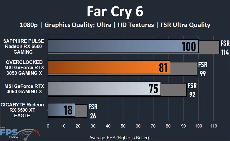 In Far Cry 6 at 1080p and “Ultra” settings the MSI GeForce RTX 3050 GAMING X is very playable in this game at a wonderful and smooth 75FPS. This cannot be said for the Radeon RX 6500 XT which chokes in performance. This is due to the limited VRAM capacity on it in combination with the HD Textures we have enabled in the game. The MSI GeForce RTX 3050 GAMING X can handle it because it has 8GB of VRAM, and has no problem performing greatly with these higher resolution textures at 1080p.