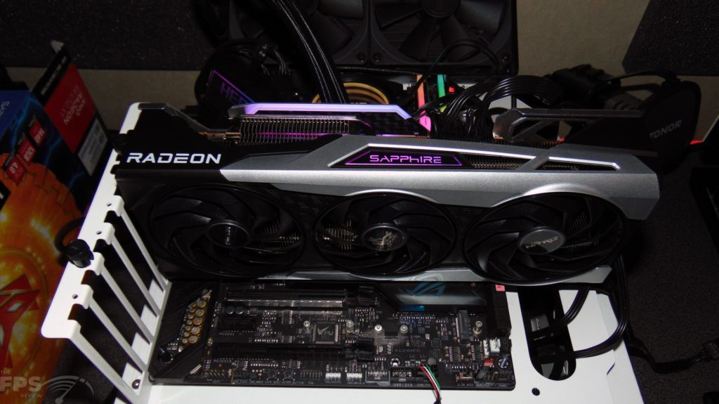 The SAPPHIRE NITRO+ AMD Radeon RX 6750 XT measures 12.2” inches in length, 4.6” inches in width, and is 2.4” inches in height. It does require 2 x 8-pin PCI-E Power Connectors. SAPPHIRE states total power consumption is 273W, and the minimum suggested Power Supply is 650W. The video card features 1x HDMI and 3x DisplayPort.