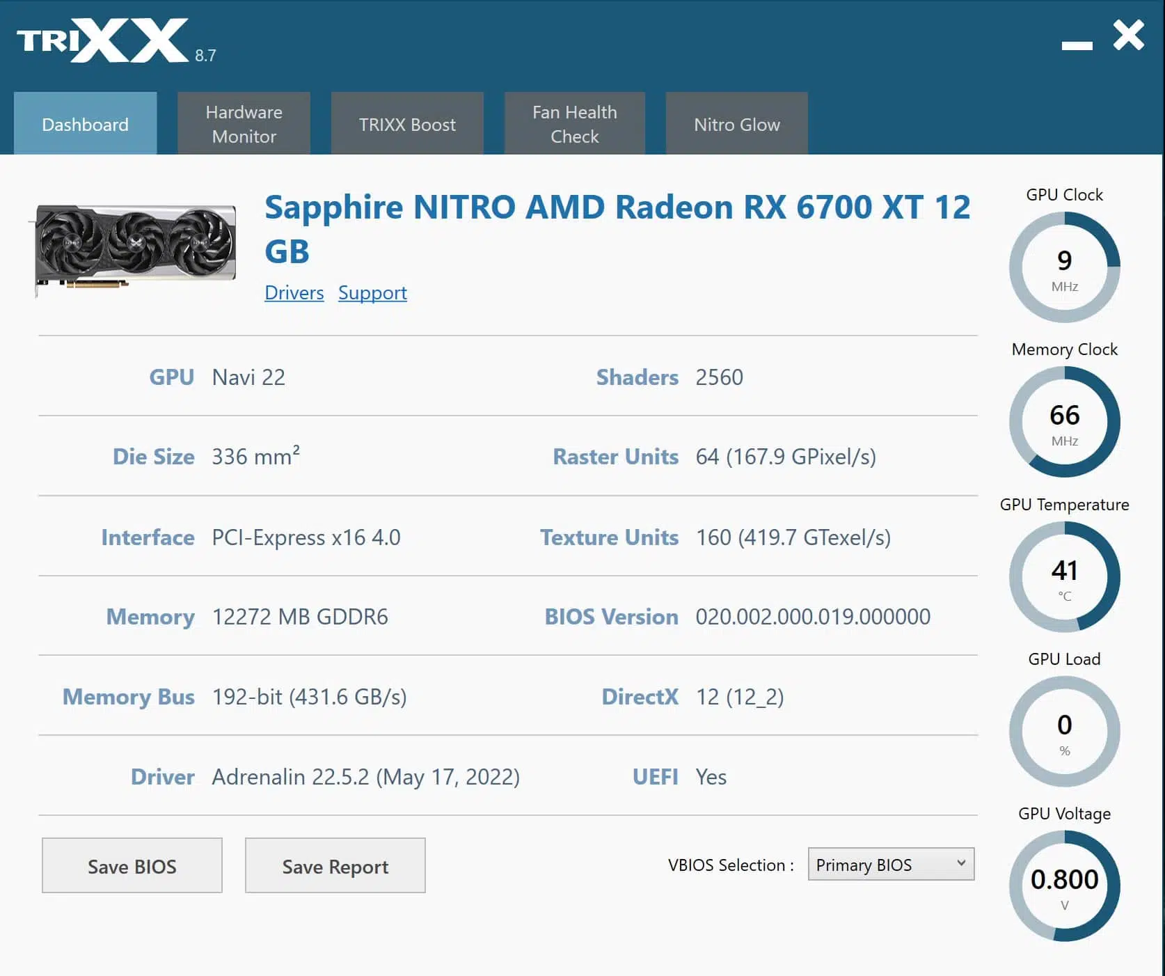Here are the screenshots of the functions that TriXX allows, which does have monitoring built-in. Unfortunately, it does not have any overclocking ability on the NITRO+ series. Note, in the first screenshot TriXX is incorrectly reporting the card as a 6700 XT, appears the software needs an update, our card is indeed the 6750 XT.