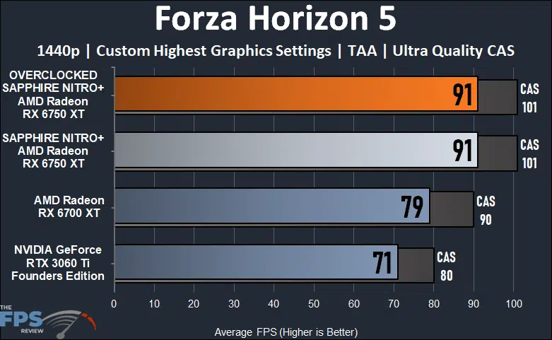 In Forza Horizon 5 the SAPPHIRE NITRO+ Radeon RX 6750 XT is able to play this game at 1440p with the highest possible in-game settings. It does so at a very fast 91FPS, which is 15% faster than the Radeon RX 6700 XT, the highest difference we’ve seen yet. That’s a pretty significant difference in performance. Oddly, overclocking the video card did not result in any change in performance, we got the same performance with the video card overclocked in this game, it could be an anomaly. At any rate, the new SAPPHIRE NITRO+ Radeon RX 6750 XT is the best card in this lineup for this game in terms of gameplay experience.