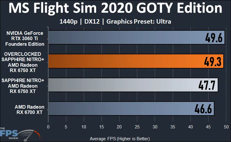 In Microsoft Flight Sim 2020 all the video cards ended up being playable at 1440p. The faster card though was the GeForce RTX 3060 Ti here. Still, the overclocked SAPPHIRE NITRO+ was able to keep up, practically the same as the RTX 3060 Ti performance. Overclocked, the SAPPHIRE NITRO+ was 6% faster than the RX 6700 XT.