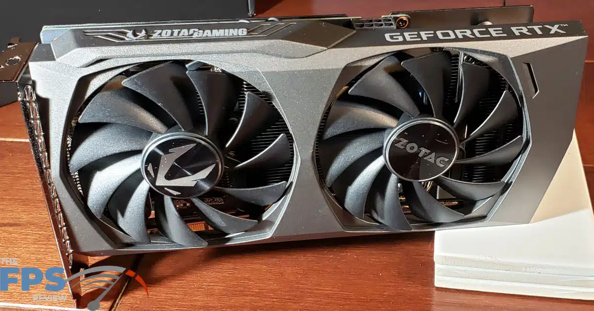 As stated our card is one of four in ZOTAC’S product offering at RTX 3050. Only the AMP version has a higher Boost Clock. Our video card features dual fan cooling with a three-heat pipe direct contact heatsink. As part of the IceStorm 2.0 cooling, the heatsink has greater coverage and the fans can be independently controlled. You can see that the heatsink extends well beyond the rear of the PCB.