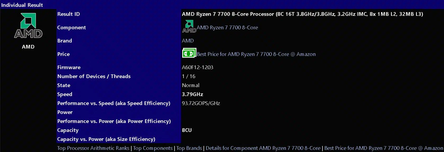AMD’s unannounced Ryzen 7 7700 (8C/16T) and Ryzen 5 7600 (6C/12T) processors have appeared on the Si Software Database, adding credence to the existence of two new non-X Ryzen 7000 Series SKUs that red team will presumably announce in the near future. Both CPUs are listed with a clock speed of 3.79 GHz, which hints at a difference of around 700 MHz and 900 MHz versus the current Ryzen 7 7700X and Ryzen 5 7600X options, which feature base clocks of 4.5 and 4.7 GHz, respectively. AMD’s Ryzen 7 7700 and Ryzen 5 7600 chips are also expected to feature a TDP of 65 watts, far away from the power demands of the Ryzen 9 7950X and Ryzen 9 7900X flagships, which are listed with a 170-watt TDP.