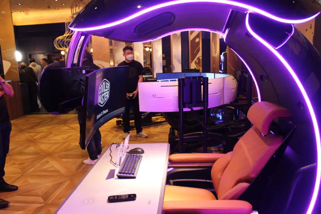 In short, Cooler Master will offer an assortment of frames allowing you to customize your driving experience with the three 49″ monitors that you see above, as well as different driver cockpits depending on your preferences (for example, distance from pedals/wheels). We did a few laps around the course enjoyed the overall experience – except the fact we had the “close to the wheel” version of the frame and had to leave a leg hanging off the side.