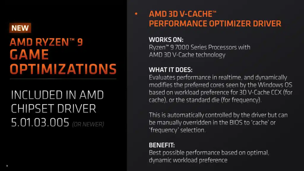 How Windows is going to manage this comes down to software implemented by AMD via an SBIOS update and its chipset drivers. The AMD Chipset drivers will include new software called AMD 3D V-Cache Performance Optimizer Driver. This driver evaluates in real-time and dynamically modifies the preferred cores seen by the Windows OS based on workload preference.