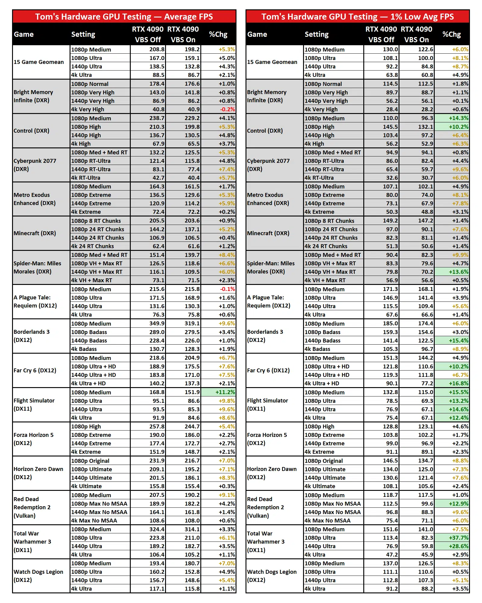 The biggest improvement overall comes in Microsoft Flight Simulator, which makes sense as that game tends to be very CPU limited even with the fastest possible processors. Turning off VBS consistently improved performance in our RTX 4090 testing by around 10%, and the 1% lows increased by as much as 15%.