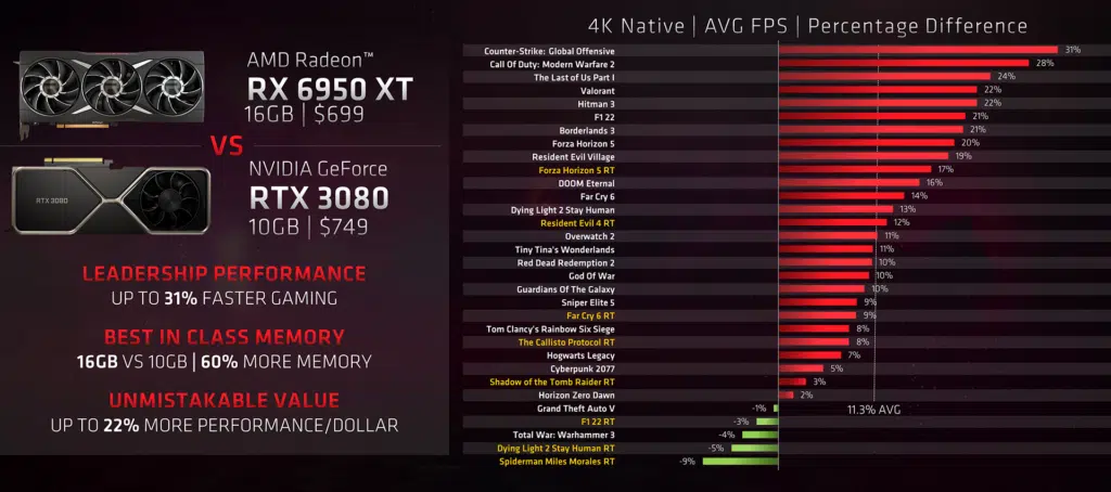 AMD has shared a handful of new GPU benchmark comparisons in an effort to convince enthusiasts why its Radeon graphics cards are a better choice than what NVIDIA has to offer with its GeForce RTX 30 and 40 Series. According to the benchmarks, the Radeon RX 6800 XT, Radeon RX 6950 XT, Radeon RX 7900 XT, and Radeon RX 7900 XTX outclass their GeForce competitors in various fields, including gaming performance, better performance/dollar, and higher memory capacity, while a blog post titled “Are YOU an Enthusiast?” includes a section about the importance of memory, with AMD seemingly implying that NVIDIA is skimping on VRAM capacity with its GeForce GPUs. One comparison points out how the Radeon RX 7900 XTX features 20 GB of memory for $999, while the GeForce RTX 4080 features 16 GB of memory for $1,199. Yet another relating to peak memory usage in newer games would suggest that at least 12 GB of VRAM is required for proper 4K gaming. (AMD points out multiple times that it offers GPUs with 16 GB of VRAM starting at $499.)