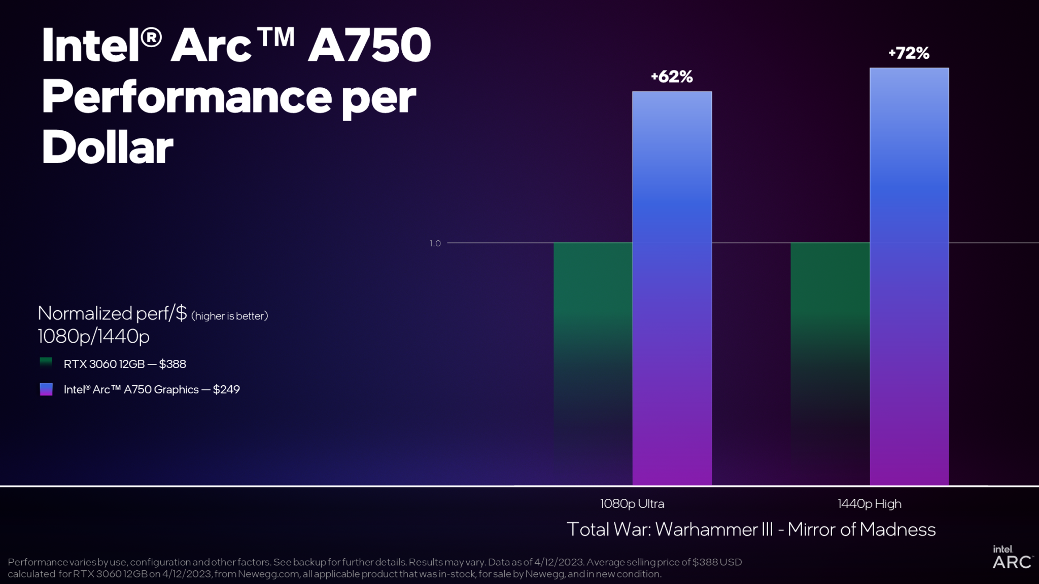 Intel Arc GPUs fear no chaos and are mighty enough to handle the battles of epic proportions in Mirror of Madness. The Intel Arc A750 is 10% faster than the RTX 3060 in Total War: Warhammer III’s Vortex benchmark, making for 72% more performance per dollar.