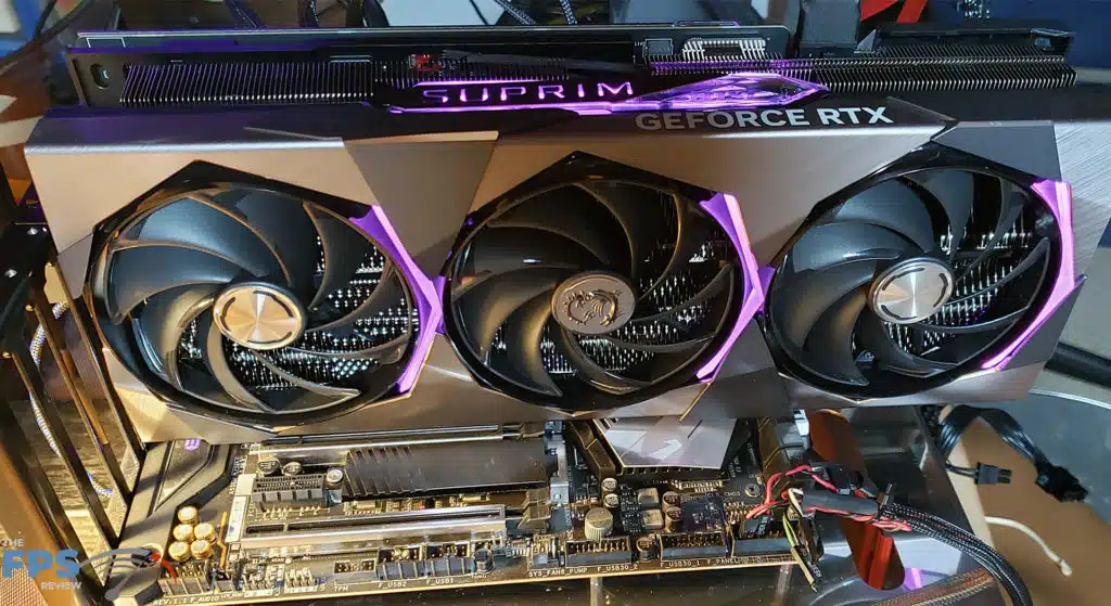 When you pick this video card up, it’s heavy and thick. The design is identical to the 4080 SUPRIM X, measuring 13 ¼ x 5 x 3 inches. This nearly 4-slot card is however heavier than its 4080 brother by 3 ounces, weighing in at 5 pounds 5 ounces. The I/O is equipped with a 3 x rev 1.4 Display Port and 1 rev 2.1 HDMI. The RGB on the SUPRIM X is nicely subtle. There are chevrons flanking the fan ports, an “MSI SUPRIM” on the top edge, and a diamond on the backplate. The lighting is controlled by Mystic Lighting in the MSI Center software package download.