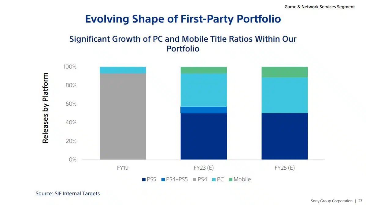 According to the slide, gamers could see up to forty percent of PlayStation Studios’ first-party titles make their way to PC by 2025. Something else that’s interesting to note is that by FY25 Sony has dropped releases for its PlayStation 4 consoles and PS5 releases end up accounting for half of all of its first-party portfolio sales. Another slide also shows how ongoing YOY growth for PC titles has continued to increase over the last three years.