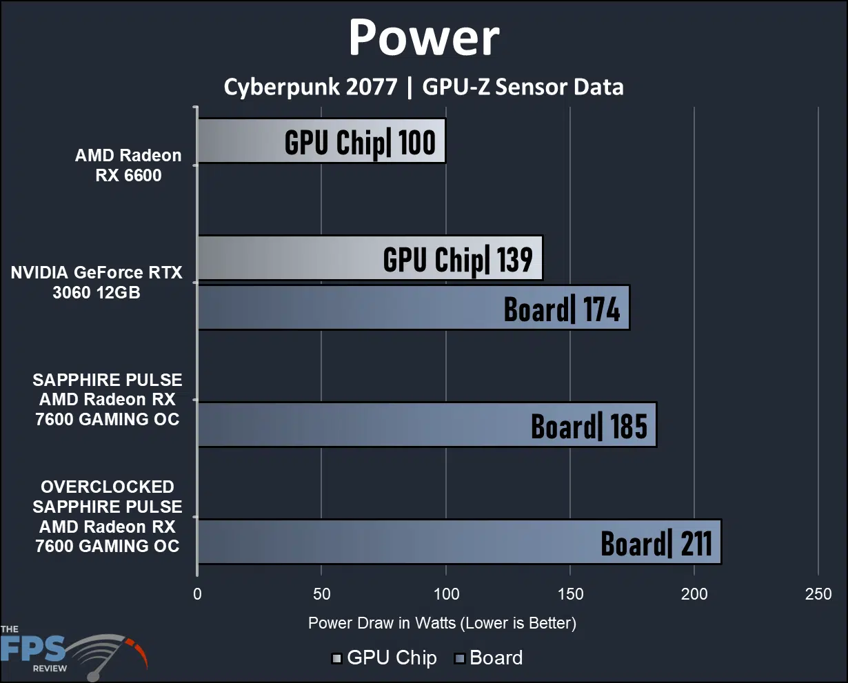 GPUZ does not have a Board Power for our RX 6600 so that gimps us a little bit. What we can comment on is the stock SAPPHIRE PULSE RX 7600 takes exactly the top limit of the wattage specification. When overclocked it goes beyond by 9%. Suffice it to say, the SAPPHIRE PULSE RX 7600 OC does draw more wattage than the older cards.