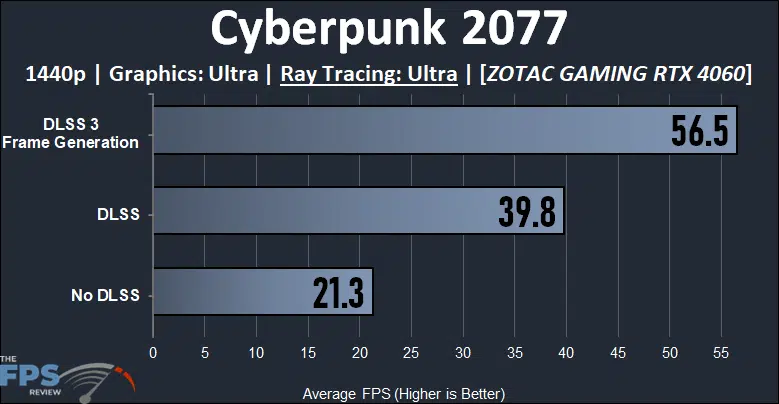 Given that DLSS 3 Frame Generation is an important part of the new GeForce RTX 4060, we wanted to see what kind of framerate increase it can provide. We focused on one game, Cyberpunk 2077 because it is always demanding, especially with Ray Tracing. We tried both 1080p, and 1440p to see if the GeForce RTX 4060 can allow a playable 1440p gameplay experience in a demanding game.