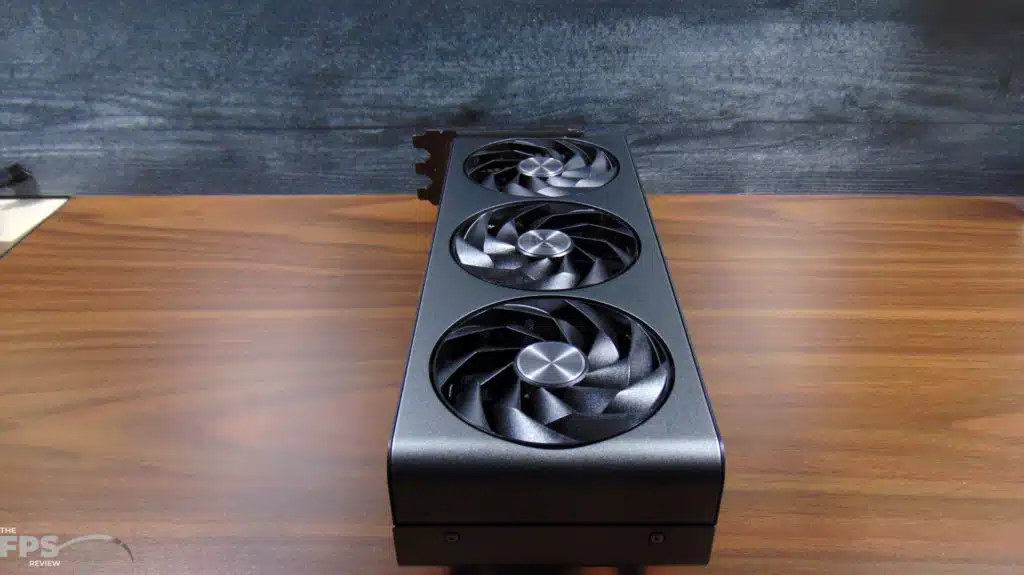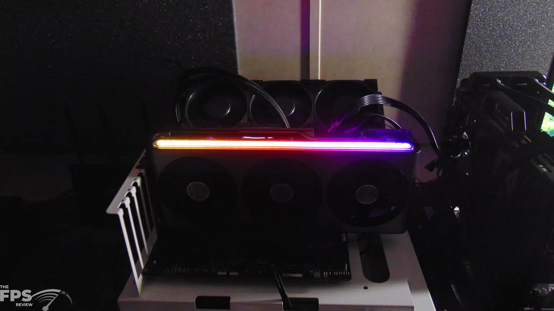 The overall design is a triple axial fan design, with a heatsink shroud that wraps around across the back end and has a full backplate. It uses a die-casted aluminum-magnesium alloy frame. There is an air pass-through on the end, as the heatsink extends past the PCB length. The back of the GPU is left exposed, and the backplate is vented so it won’t trap heat. Atop the top edge of the video card is the ARGB light strip and the power connectors are recessed with an opening to easily get to.