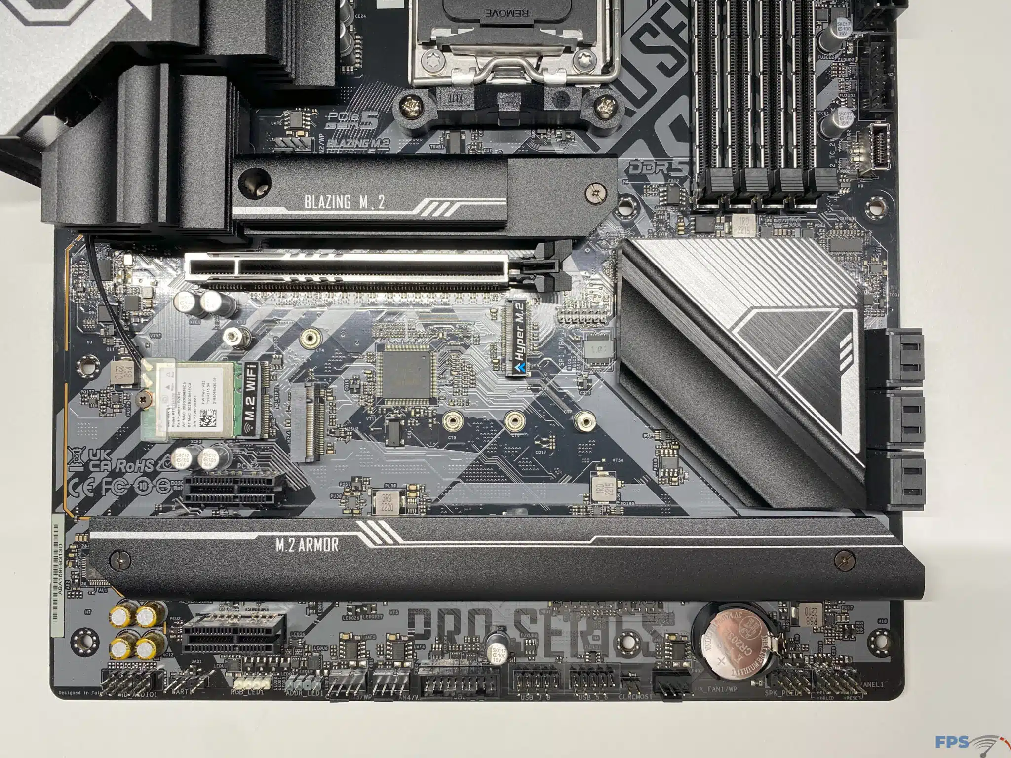 The overall layout and construction of this motherboard is very similar to the B650 Pro RS, which we quite liked. This motherboard is well built with a hefty cooling solution on the digital VRMs, as well as the cooling provided for the chipset and three of the M.2 slots.