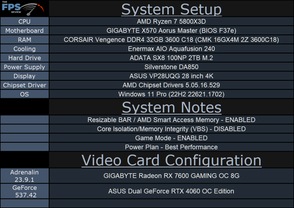 We are using the motherboard’s current default BIOS settings on the latest official release BIOS. We have enabled PCI-Express Resizable BAR in the motherboard BIOS. This means we are utilizing Resizable BAR on NVIDIA GPUs and AMD Smart Access Memory on AMD GPUs in all of our testing. We have enabled DOCP in the BIOS for the memory. We are using a fresh install of Windows 11 Pro with the latest Windows Updates, and drivers installed including the latest chipset drivers from AMD. We are using the “Best Performance” power profile in Windows Settings. We have hardware-accelerated GPU Scheduling at the default setting, which is ENABLED. VBS is DISABLED and Game Mode is ENABLED.
