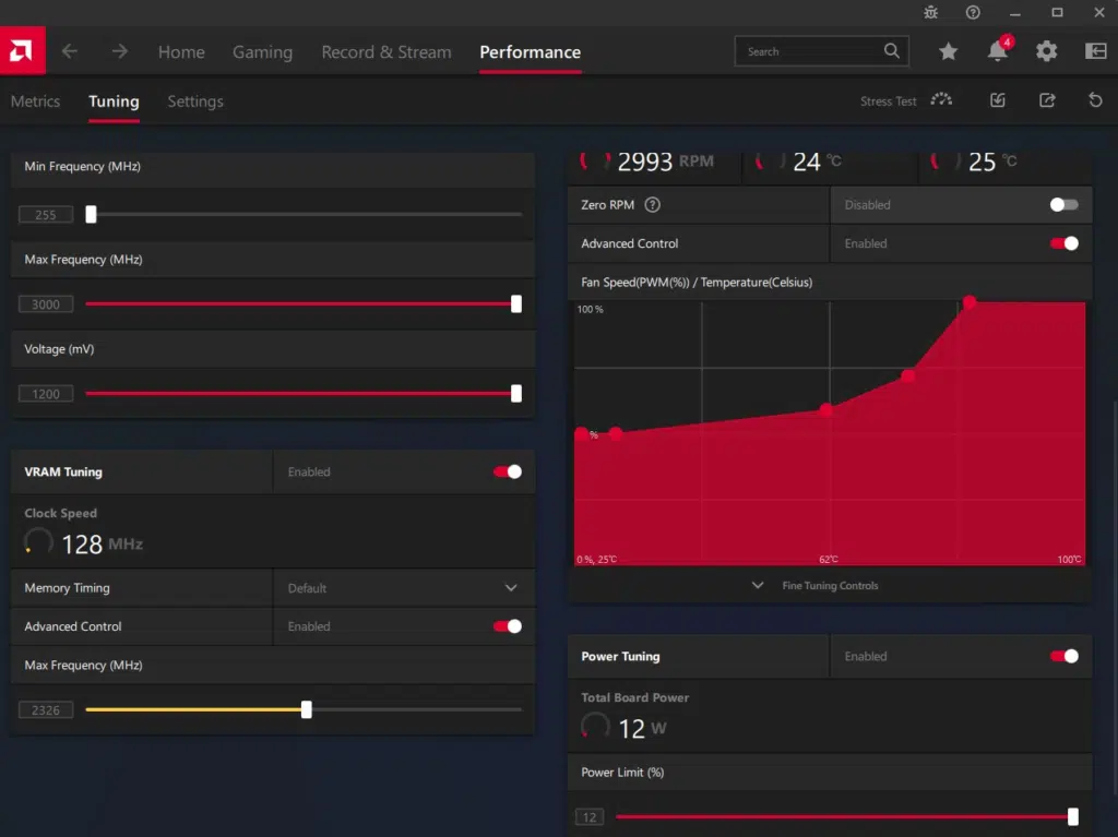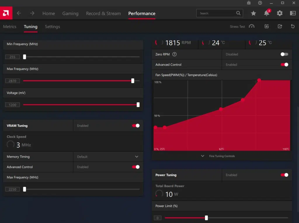 For overclocking the GIGABYTE Radeon RX 7600 GAMING OC we used the performance software included in the current version of AMD’s Adrenalin Software Performance Tuning. Here we can adjust the GPU clock frequency maximum, memory frequencies, fan cycles, and power target. The GPU core voltage is maximized by default. The default settings are shown above. Recall that the “Maximum GPU Frequency” is not an absolute, it is simply the maximum limit set on the GPU.