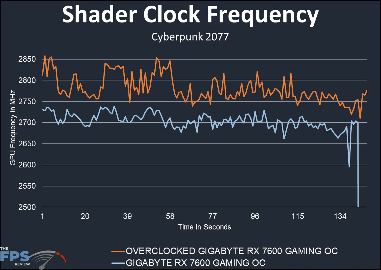 Recall that the out-of-box Game clock for the GIGABYTE Radeon RX 7600 GAMING OC is 2356MHz, which is a full 106MHz or 4.7% beyond the reference clocks. Our testing looks at the Front end and shader clock performance. Our Front end clock default is an average of 2674MHz. Overclocked it reached an average of 2745MHz or 2.6% boost. Meanwhile, the Shader clock by default averages 2703MHz and when overclocked 2780MHz, or a 2.8% lift. So, basically increasing the GPU “maximum” frequency to 130Mhz pushed the performance up by 70MHz over default out-of-the-box.
