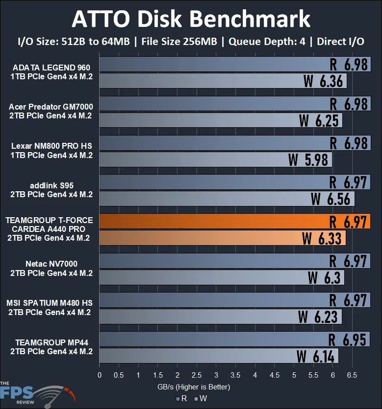 In ATTO, the TEAMGROUP T-FORCE CARDEA A440 PRO 2TB SSD has a really good showing as well, with a read speed of 6.97GB/s matching the addlink S95, and right on par with the fastest read times on the Lexar NM800 PRO, Acer Predator GM7000 and ADATA LEGEND 960. Its write performance is also very strong at 6.33GB/s in this test, beating the Lexar NM800 PRO and Acer Predator GM7000, and TEAMGROUP MP44. These are very strong results.