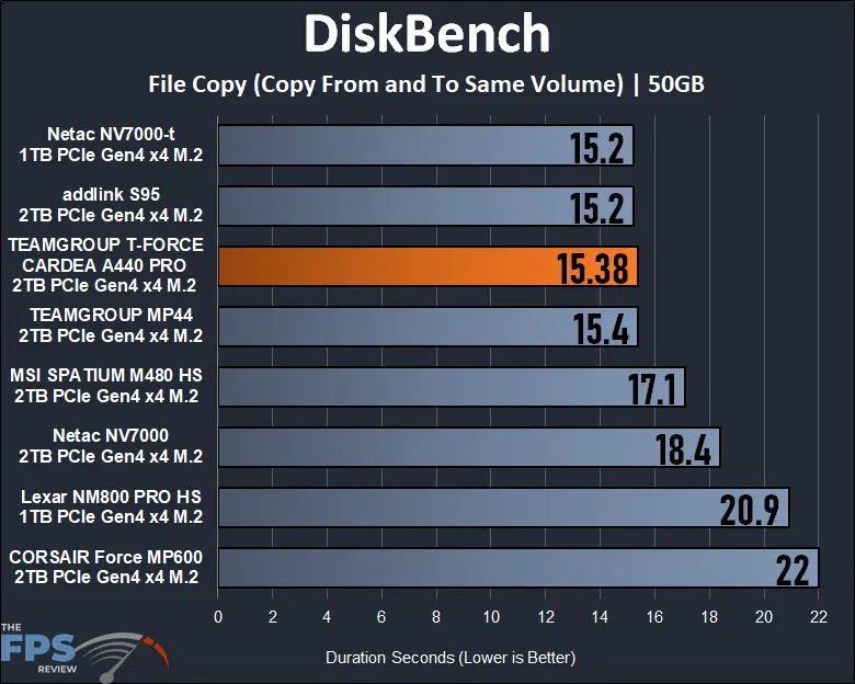 The TEAMGROUP T-FORCE CARDEA A440 PRO 2TB SSD is also no slouch in direct file copy performance in DiskBench. It took only 15.38 seconds to copy our file, which puts it in between the addlink S95 and TEAMGROUP MP44, it actually was a hair faster than the MP44. This puts it way ahead of the Lexar NM800 PRO SSD and the older CORSAIR Force MP600. This is a really solid file copy time.