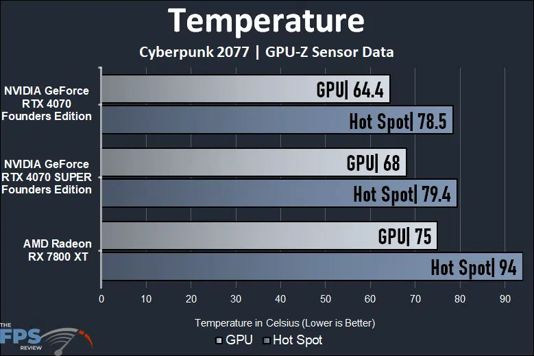 Though the GeForce RTX 4070 SUPER pulls 17% more power, the GPU temperatures do not increase that much. The Founders Edition has the same design on both video cards, and we see the GeForce RTX 4070 SUPER only has about a 6% warmer GPU or a 3.6-degree difference. The hot spot temperature only increases by 1 degree. These are very good temperatures and show how good of a cooler the Founders Edition cooler is. By comparison, the Radeon RX 7800 XT runs very hot, with 75c GPU and 94c Hot Spot, these temperatures are in vast contrast to the RTX 4070 and RTX 4070 SUPER Founders Edition cards.