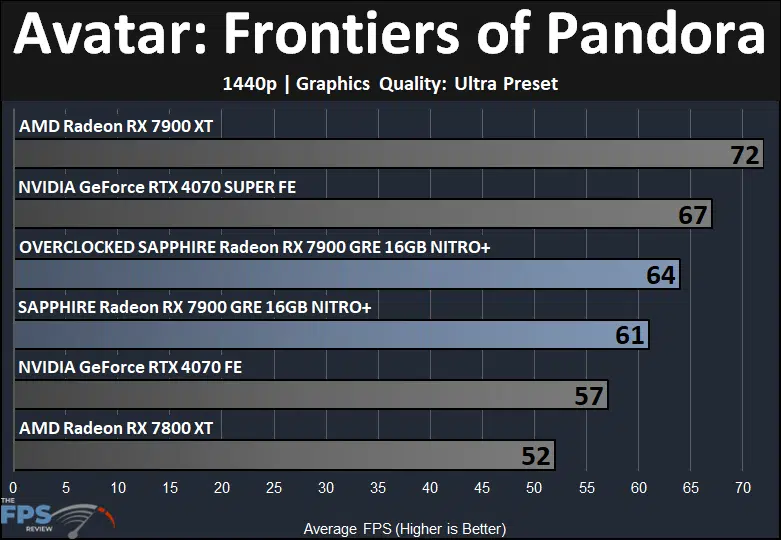 With the use of ray tracing built-in by default, this game is very demanding on Ultra at 1440p. In fact, the RTX 4070 and 7800 XT struggle with performance, and therefore only the SAPPHIRE RX 7900 GRE NITRO+, RTX 4070 SUPER, and RX 7900 XT are at playable levels without upscaling. The SAPPHIRE RX 7900 GRE NITRO+ is 17% faster than the Radeon RX 7800 XT, and 15% behind the 7900 XT. The 7900 GRE is 7% faster than the RTX 4070, and 9% behind the RTX 4070 SUPER. Overclocking adds about 5% to performance.