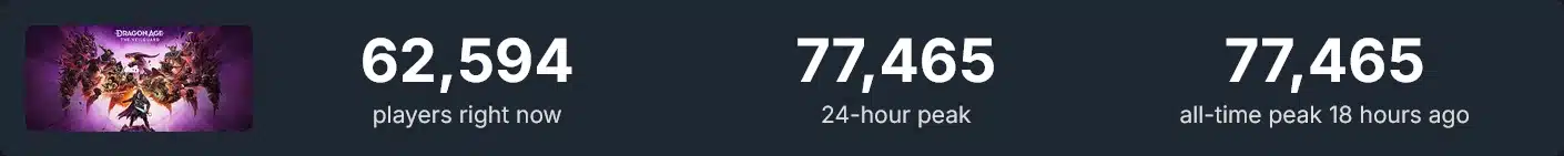 Dragon Age: The Veilguard is off to a good start according to data from Steam where reported player counts have set a new record. The latest franchise installment has managed to surpass all of BioWare’s previous games on Steam by a significant margin with its peak concurrent player count. Dragon Age: The Veilguard launched for PC and consoles on October 31 and within 24 hours it reached a max total of 77,465 players. That total dipped down to around 30,000 but has since been climbing up again, currently climbing towards 63,000.