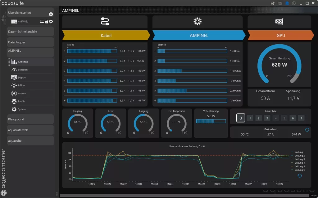 By using MOSFETs, shunts, and a fast MCU, AMPINEL can provide real-time load balancing via analog and digital means, thus ensuring that pins in the 12HPWR/12V-2×6 connector receive equal power distribution. Snake oil, marketing shenanigans, nope, the AMPINEL actually features technology that many would consider should already be present on graphics cards with these connectors. Components are packed onto a six-layer PCB, each is 70 µm copper, and includes a configurable display. A robust software solution is also provided for close monitoring of 40 measured values and further configuration. The device retains support for the “sense” pins, which are designed to detect improper connector insertion and can also use them to shut down power delivery when other dangerous events occur. An 85 dB buzzer will alarm when something has gone awry.