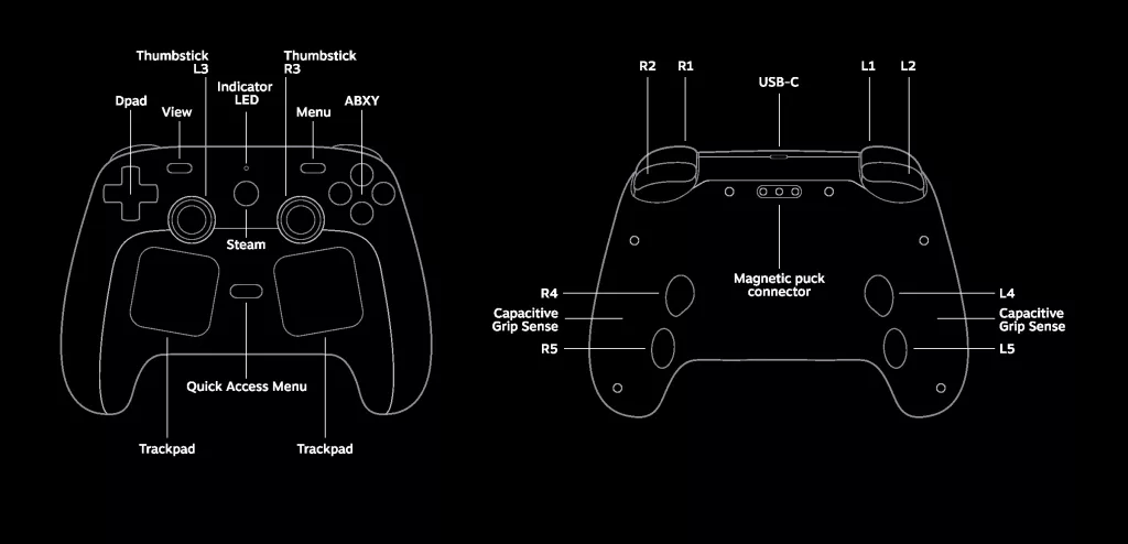 - Gamepad controls: A B X Y buttons, D-pad, L & R analog triggers, L & R bumpers, View & Menu buttons, Steam & QAM buttons, 4x assignable grip buttons