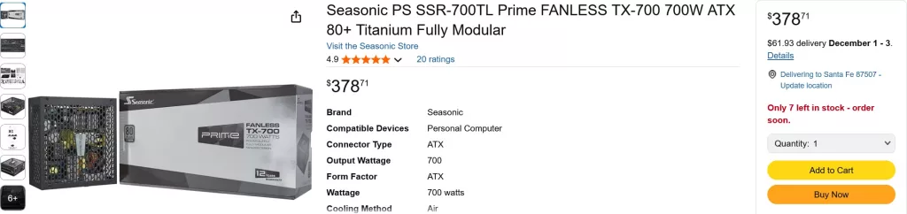 With a power efficiency between 91% and 93%, these passively cooled PSUs offer the best of both worlds for silent power delivery and are fully modular as well. However, if the 1000W model features the same connectors, do not expect a 12V-2×6 option, as neither of the current models has this, which means that users with GPUs featuring that connector will need an adapter. As these are likely aimed at non-gaming scenarios that lack the aforementioned connector, it is probably a moot point for those applications where silence is the priority. It will also be interesting to see what the 1000W variant will be priced at, since the 700W version currently goes for a hefty chunk of change, as power supplies go, on Amazon. Below is a snapshot of current pricing for that model, along with its specifications from Seasonic, to give an idea of what to expect for the 1000W version.