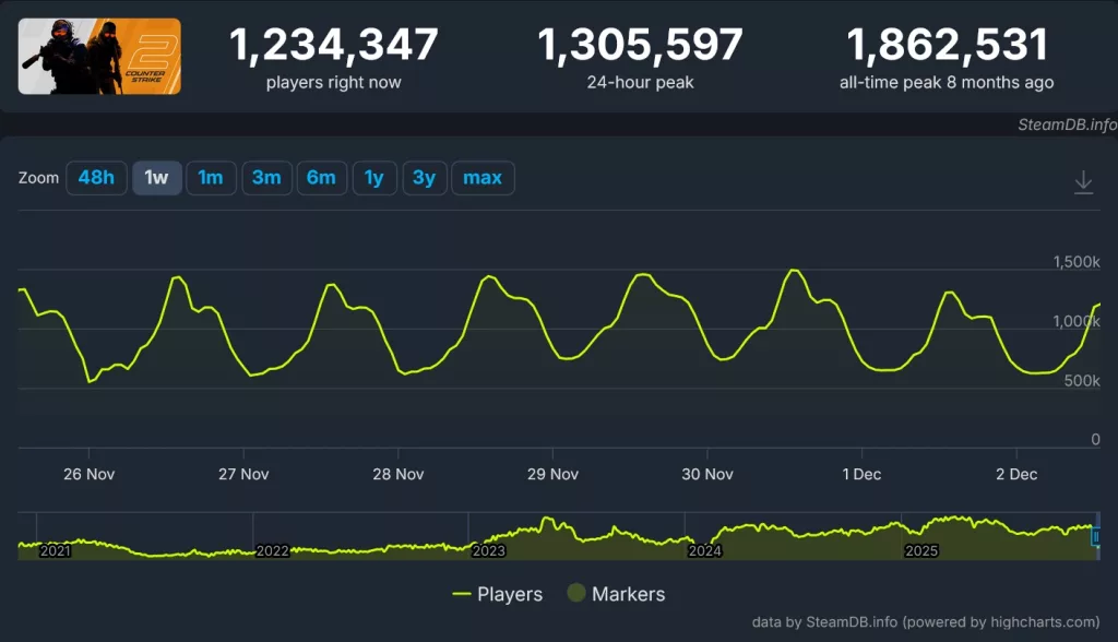 Counter-Strike 2 Continues to Pull In over 1 Million Players Despite Competition from Battlefield 6, ARC Raiders, and Call of Duty: Black Ops 7