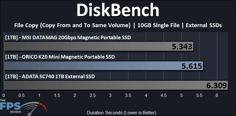 Things change, though, when the file size increases. With a 10GB file, the ORICO K20 Mini 1TB Ultra-thin Magnetic Portable SSD is now faster than the ADATA SC740, at 5.6 seconds, it is 11% faster. It is very close to the performance of the MSI DATAMAG here; they are only .3 seconds apart. Technically the MSI DATAMAG is faster, but the margins are very close.