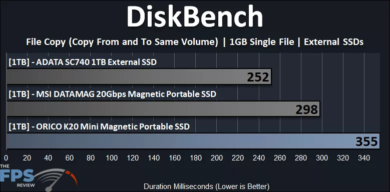 Copying a 1GB file on the ORICO K20 Mini 1TB Ultra-thin Magnetic Portable SSD goes very fast, and while it is only milliseconds, the ORICO K20Mini was the slowest at 355 milliseconds. This was 19% slower than the MSI DATAMAG and 41% slower than the ADATA SC740.