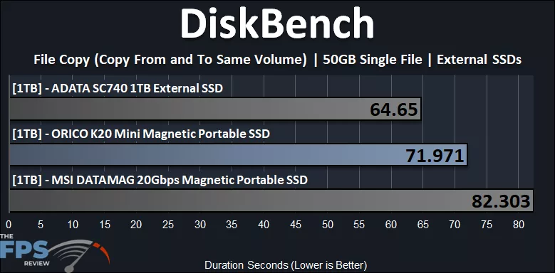 The ORICO K20 Mini 1TB Ultra-thin Magnetic Portable SSD also holds its place with a large 50GB file, taking 71.9 seconds to copy. This is 13% faster than the MSI DATAMAG 20Gbps drive, but the ADATA SC740 does edge out 10% faster.