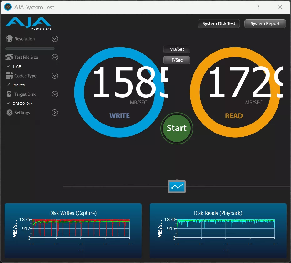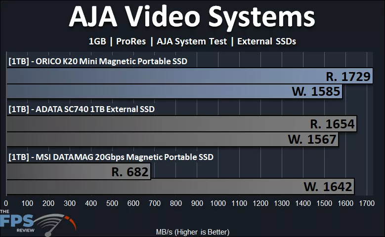 One of the benefits of the ORICO K20 Mini 1TB Ultra-thin Magnetic Portable SSD is the ability to record video from your phone or device, and ProRes is a popularly supported format. According to AJA Video Systems System Test, the ORICO K20 Mini 1TB Ultra-thin Magnetic Portable SSD does very well on performance, actually beating out both other external portable SSDs on read. On read performance, it pulls 1729MB/s, and on write performance 1585MB/s. This greatly exceeds that of the MSI DATAMAG 20Gbps Magnetic Portable SSD, with its slow read of 682MB/s. The MSI DATAMAG has a strong write performance, and the ORICO K20 Mini 1TB Ultra-thin Magnetic Portable SSD beats the ADATA SC740 on both.
