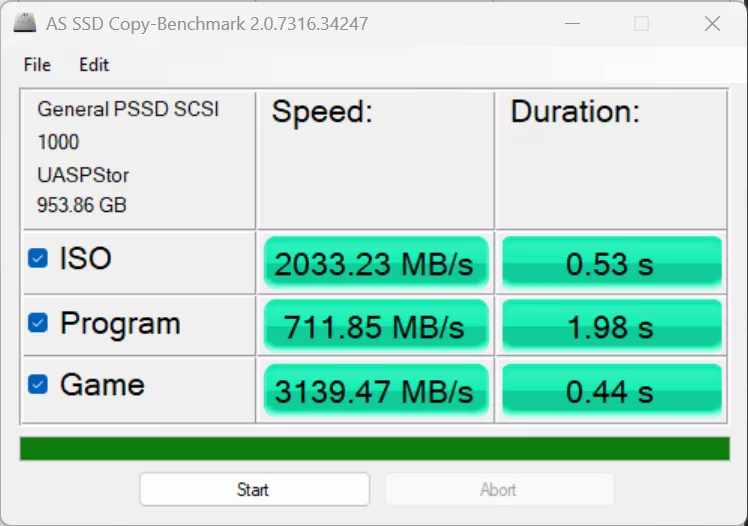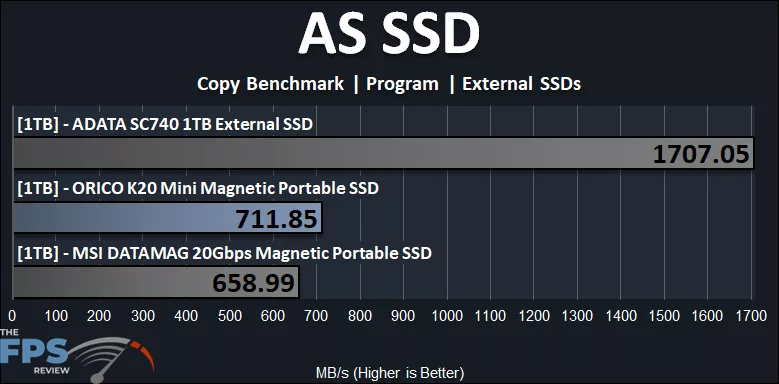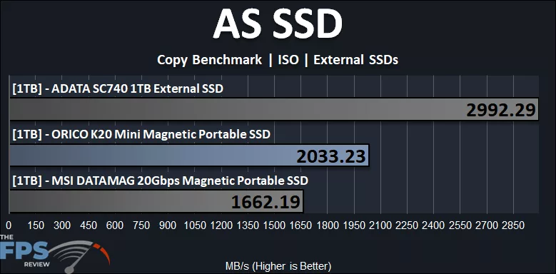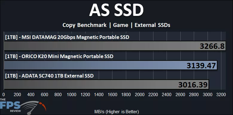 In AS SSD’s copy benchmark, ISO performance, the ORICO K20 Mini 1TB Ultra-thin Magnetic Portable SSD is 22% faster than the MSI DATAMAG 20Gbps, but 32% slower than the ADATA SC740.