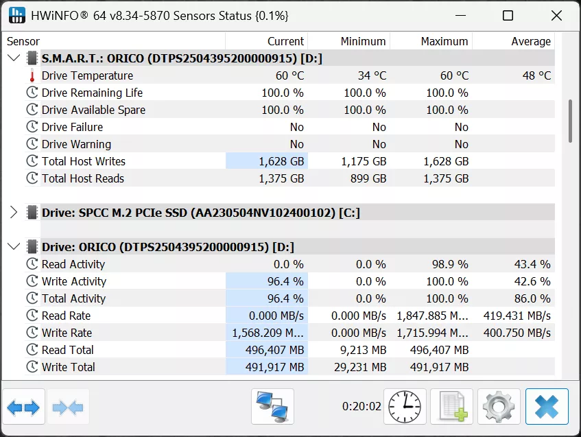 We ran some intensive stress testing on the ORICO K20 Mini 1TB Ultra-thin Magnetic Portable SSD, and fired up HWiNFO64 to look at drive temperatures, as well as an external temperature gun. In our intensive 20-minute stress test, HWiNFO64 indicated a maximum temperature of NAND or composite temperature, maxing out at 60c, as the hottest temperature. On the surface of the device, we detected the hottest temperature on the aluminum alloy cover hit 36.8c, and on the back, the hottest temperature detected was 52.4c.