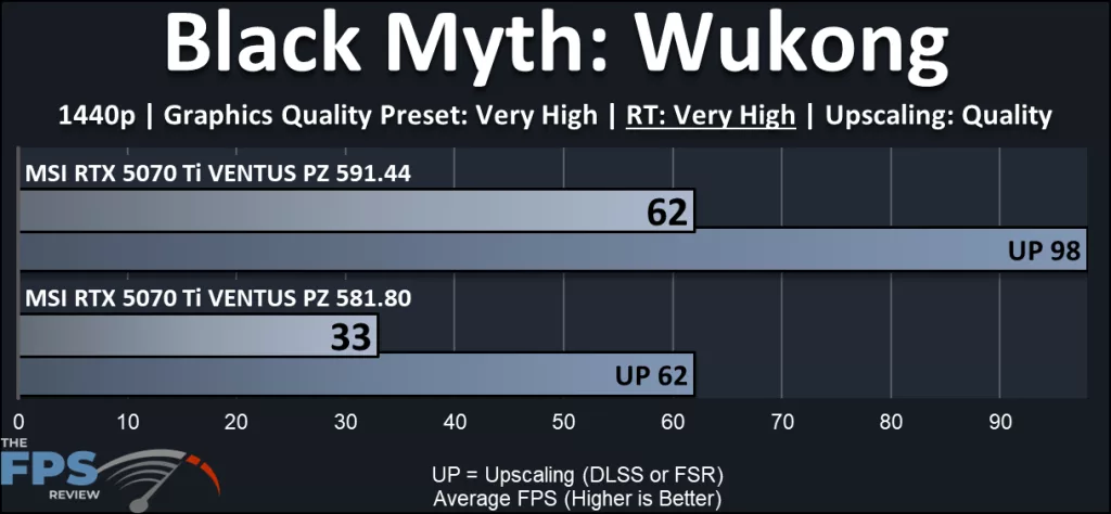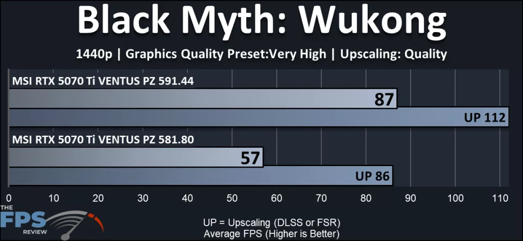 We’re currently working on a review of MSI’s RTX 5070 Ti VENTUS PZ GPU and Rick put us on notice that the NVIDIA 591.44 driver kicked in some serious VTEC, yo, on Black Myth: Wukong. It seems possible that NVIDIA is correcting for a Windows 11 update that dropped last month where users were up in arms about significant performance drops across multiple games.